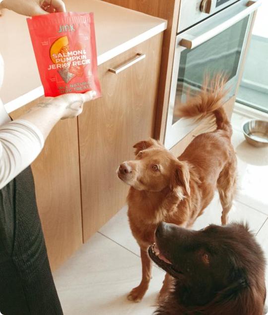 Pumpkin is such a nutritional powerhouse that Jinx includes it in every single one of their kibble recipes, year round. Jinx’s tender and savory Salmon & Pumpkin Jerky Treats are another easy way to incorporate a boost of nutrition into your dog’s routine.