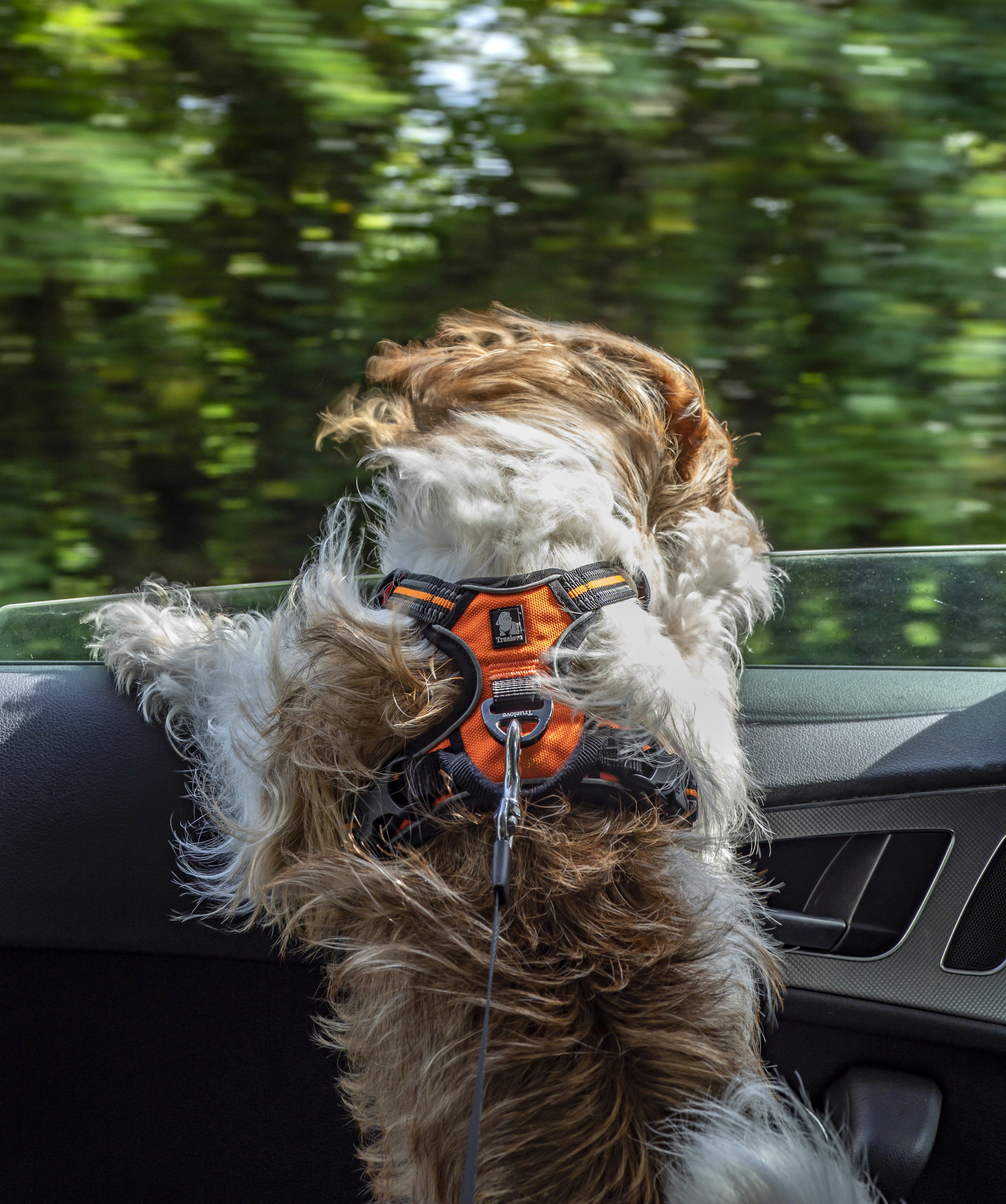 Ensure there is enough fresh, cool air supply in the car. Open the window for fresh air supply and to protect your dog from experiencing discomfort. Make sure it is not open wide enough so your dog can jump out or get injured.