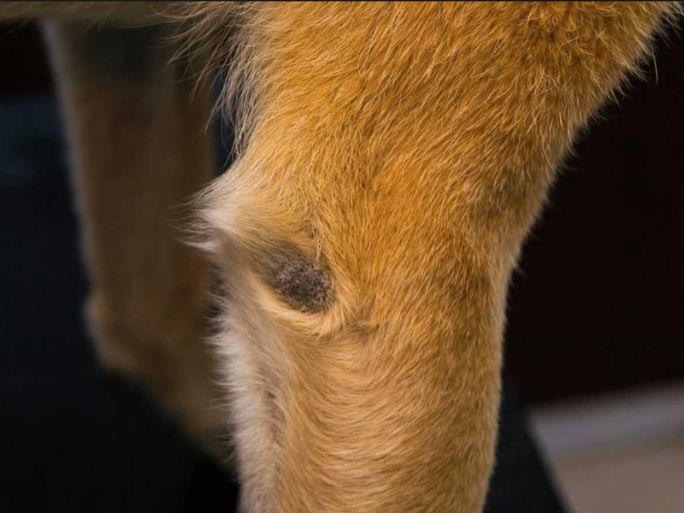 - Loss of hair around the callus. Suppose the callus is infected and causing pain for your dog; they may try to chew it off, leading to hair loss in that area.