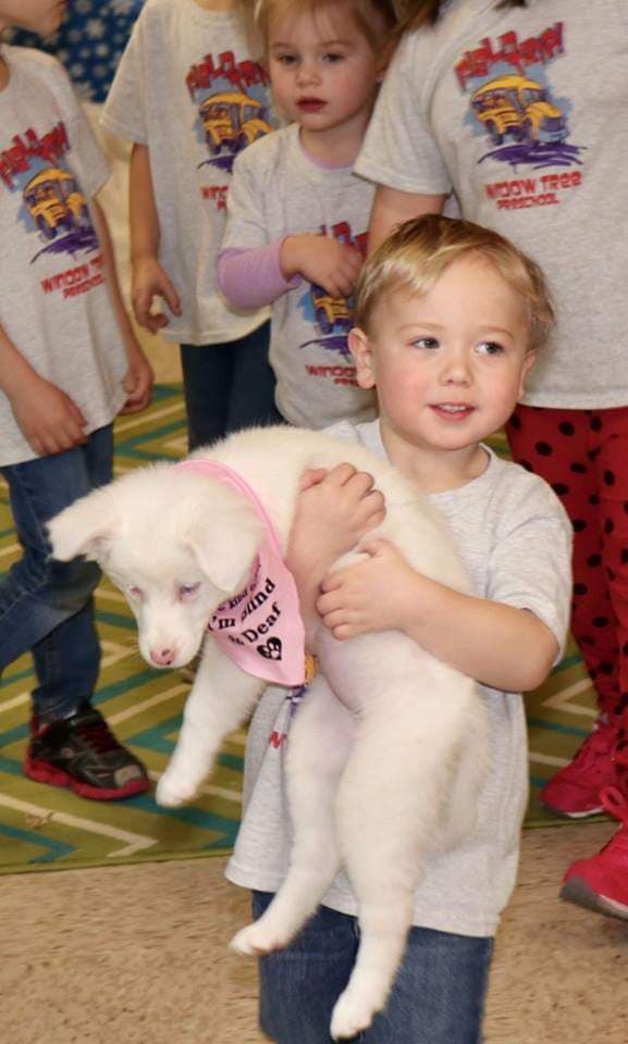 Starla! She was found by a UPS driver around Christmas time, just 5-6 weeks old, blind and deaf, sitting in the snow. She’s lucky to be alive! She’s still a puppy, but she’s already learned so many touch commands.